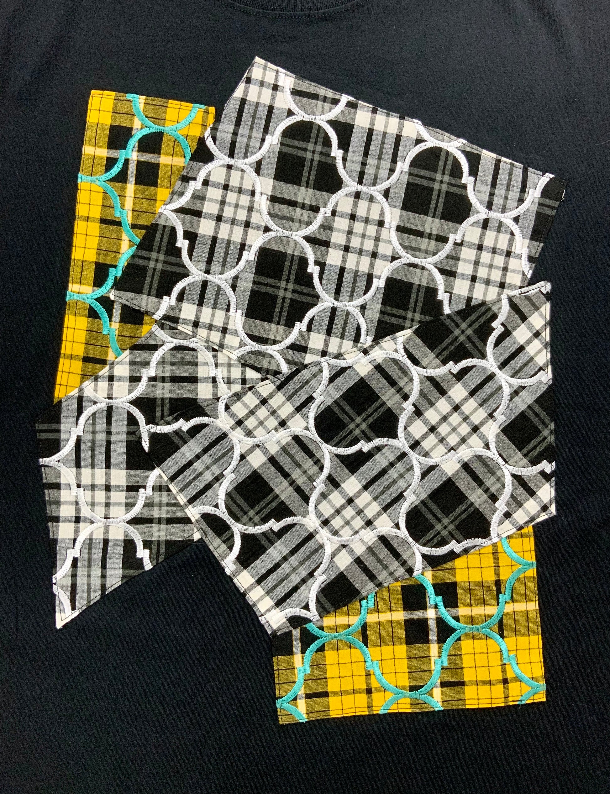 The embroidered Moroccan pattern on a tartan check fabric creates a unique and sensationally stylish product.