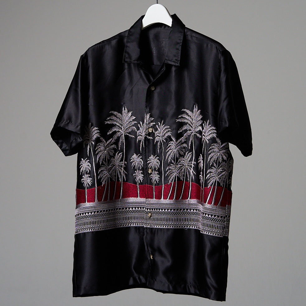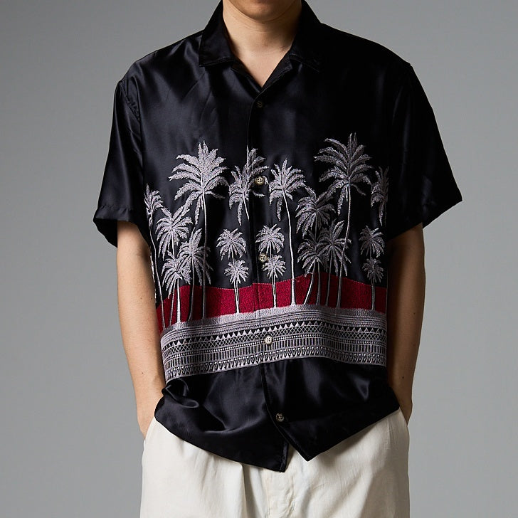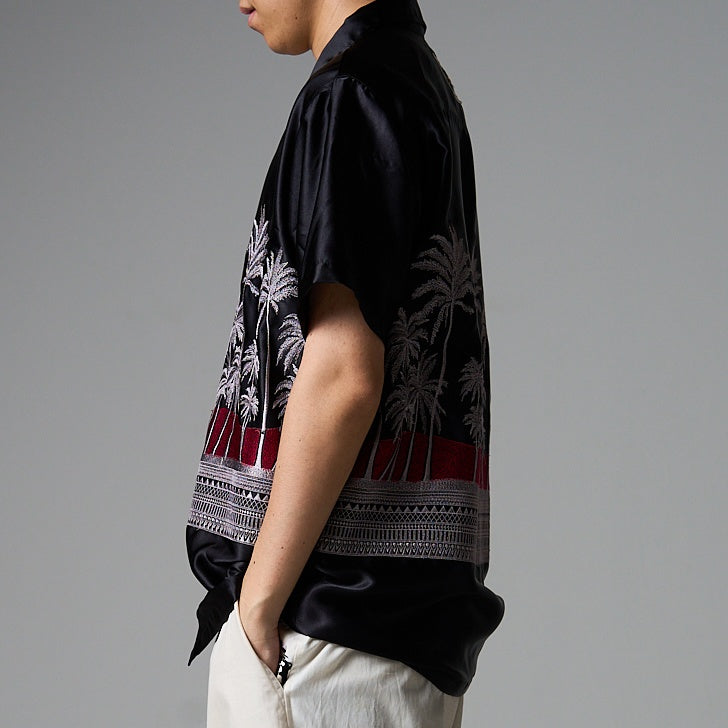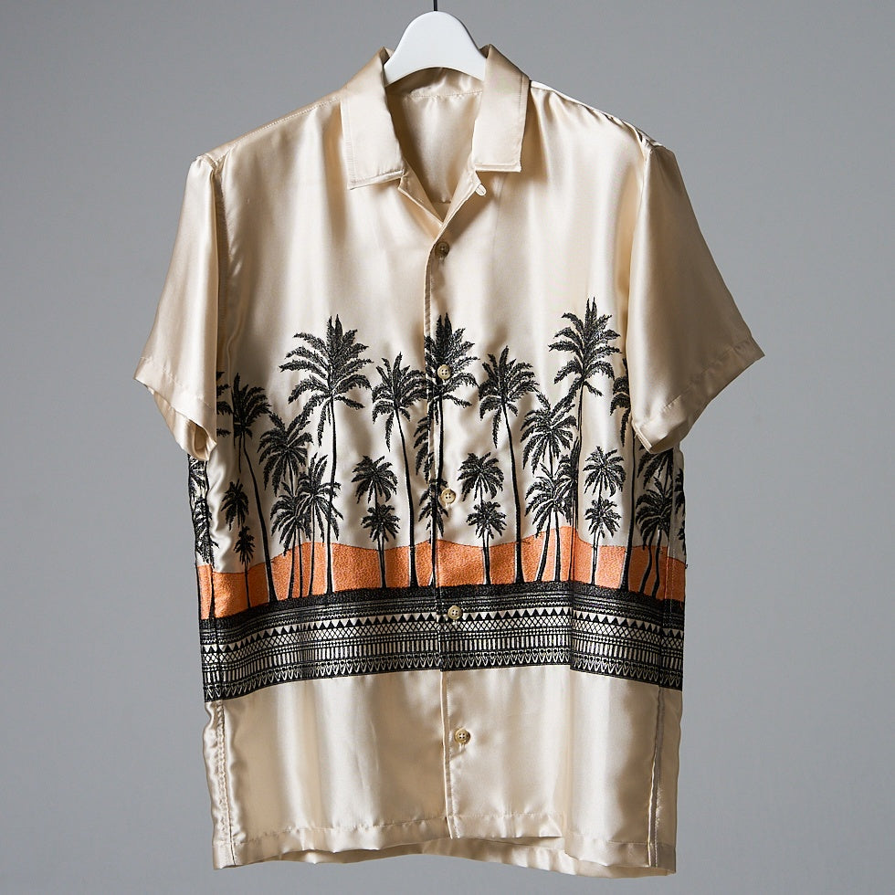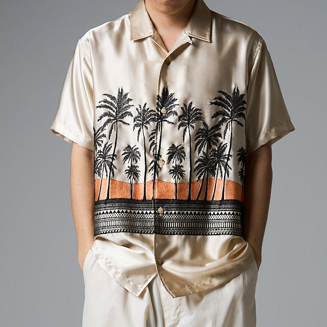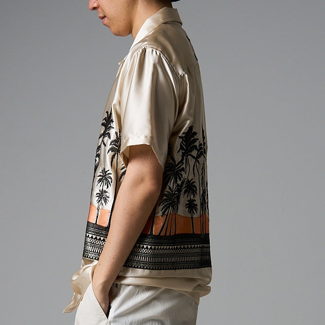 艶のあるドレープ性があるサテン生地にサンセットパームツリーの刺繍を施した半袖オープンカラー/アロハ/開襟シャツ。