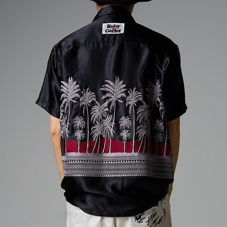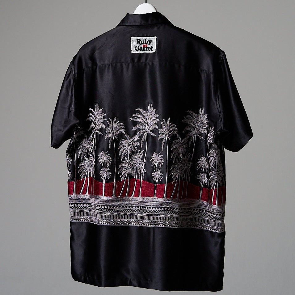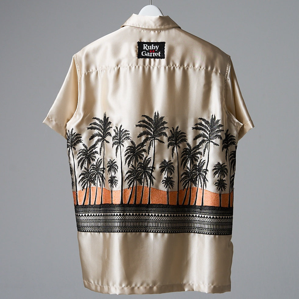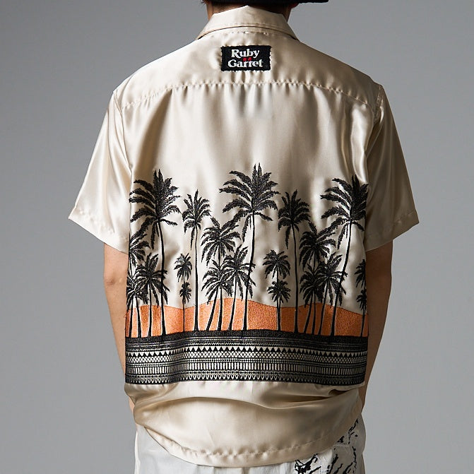 艶のあるドレープ性があるサテン生地にサンセットパームツリーの刺繍を施した半袖オープンカラー/アロハ/開襟シャツ。